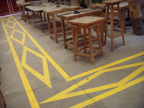 Figura 9. Líneas de evacuación marcadas en el suelo, que sirven a su vez como ordenamiento del espacio del aula.