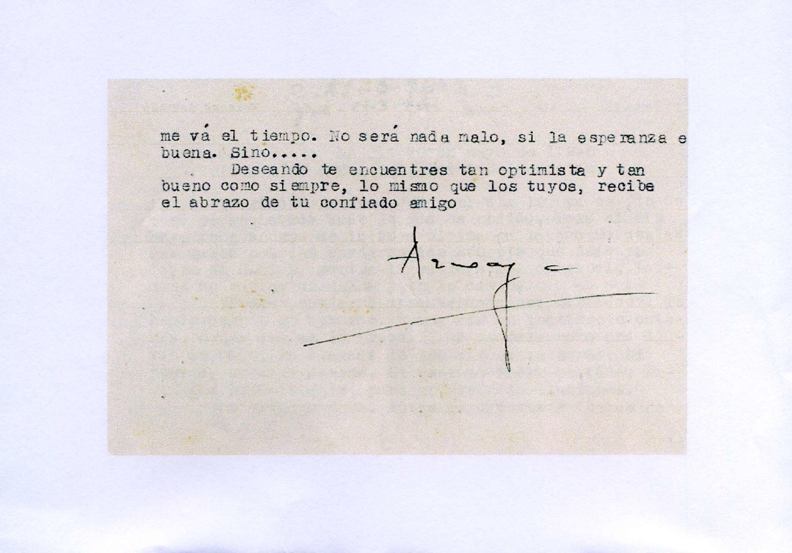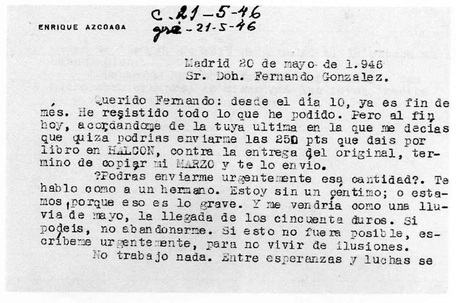 ¿Podrás enviarme urgentemente esa cantidad?. Te hablo como a un hermano. Estoy sin un céntimo; o estamos, porque eso es lo grave. Y me vendría como una lluvia de mayo, la llegada de los cincuenta duros. Si podéis, no abandonarme. Si esto no fuera posible, escríbeme urgentemente, para no vivir de ilusiones.