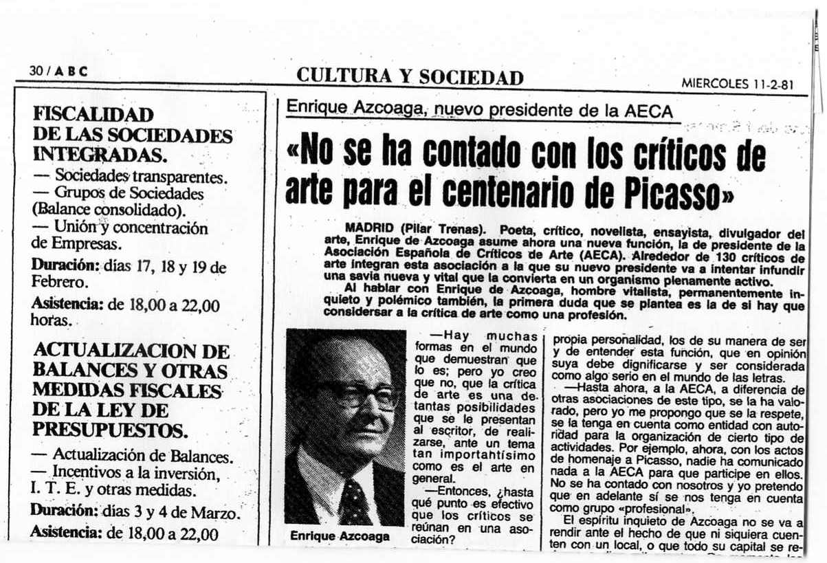 En otra carta de 1961 se lamenta de la atonía de la vida artística mencionando sin mucho entusiasmo a la Asociación Española de Críticos de Arte que había comenzado su andadura ese mismo año, presidida por José Camón Aznar (Fernández Cabaleiro, 2005 : 32): “Las galerías y las exposiciones madrileñas, por las que me preguntan, no han dado muestras de gran novedad en estos tres meses y pico que llevamos de temporada. Expuso el sobrino de Picasso verdaderas “caquitas”. Se habla de no sé cuantas cosas por parte de la Agrupación de Críticos de Arte, que luego no se hacen”.