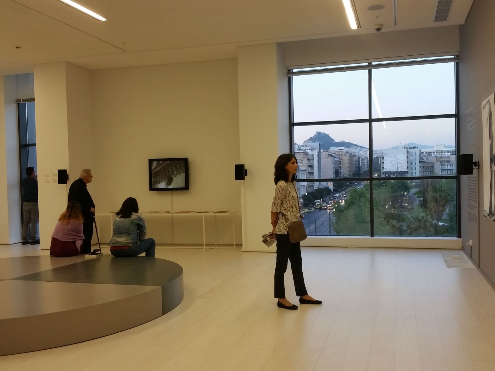 EMST (2017). Contemplando una obra en el rellano del último piso. Atenas. Foto del autor (abril 2017)