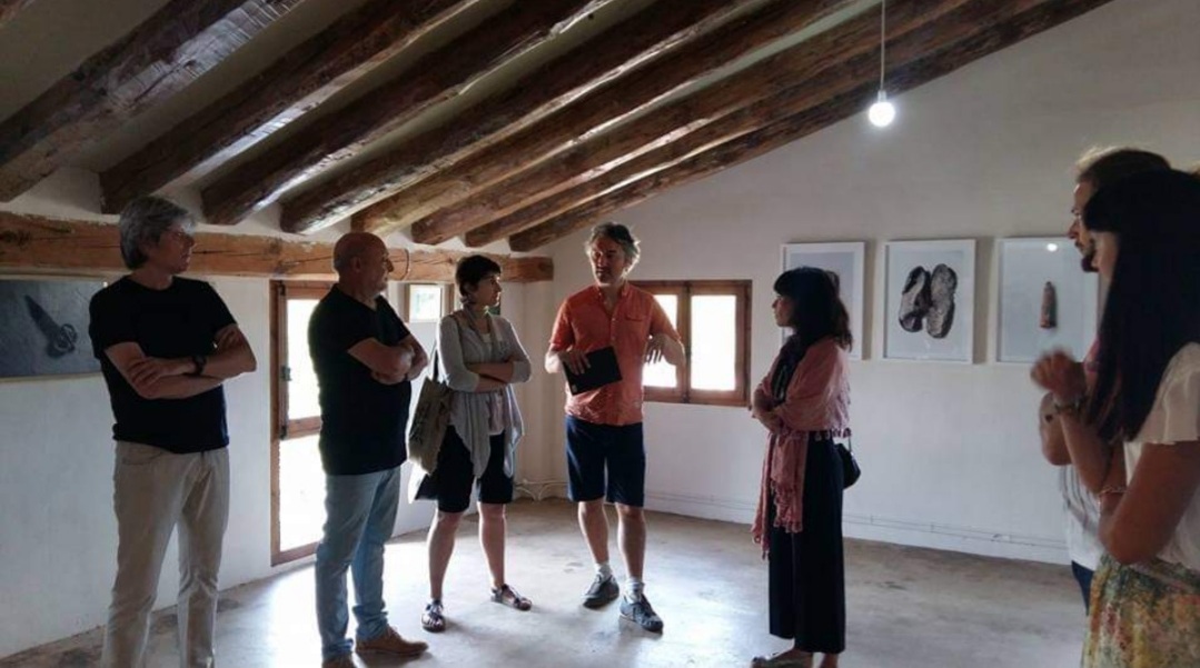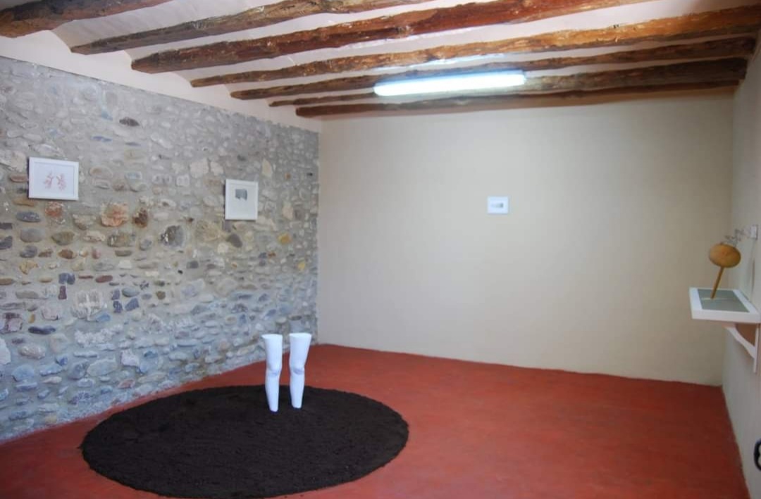 Miguel Ángel: Hay un momento en que me planteo que quiero volver a recorrer los paisajes de mi niñez, y hago visitas esporádicas al pueblo de mi padre, cuando este todavía no ha muerto, mi padre terminó su vida con demencia y esos retornos me traían muchos recuerdos. Allí he pasado los veranos de mi niñez, cuando la infancia transcurría en los caminos de tierra, en el río cogiendo cangrejos. A la muerte de mi padre compré la casa, no era la que perteneció a mi familia, pero está ubicada en la misma calle. Es una casona familiar cuyos cimientos de piedra son del siglo XVIII. La compramos con idea de pasar temporadas y desconectar al amparo de la torre mudéjar. El tamaño de la casa me permitió dividirla en diferentes espacios: la casa familiar y la zona dedicada a mi trabajo como pintor y escultor. Reservé una sala para taller, el estudio que tengo en Zaragoza se me quedaba pequeño porque trabajo mucho y he acumulado muchísima obra, ya no me cabe, precisaba por tanto de mucho espacio. Vi que otras estancias de la planta calle podían ser aprovechadas para exponer, además Marta vio en el jardín muchas posibilidades como lugar de encuentro y reunión tras haber visionado los diferentes proyectos. Todas las exposiciones, presentaciones de libros etc. terminan con un aperitivo en el jardín. La tercera planta contiene una suerte de granero abuhardillado donde vimos que las exposiciones de fotografía podían quedar muy bien, Marta pensó en ese espacio como salón de actos.