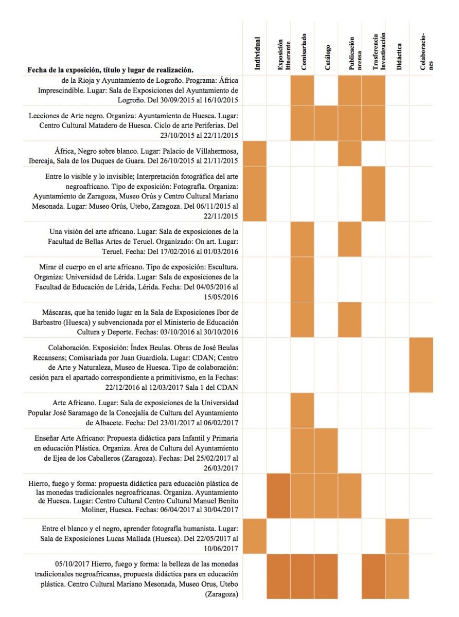 Las exposiciones comisariadas han sido 26, la mayoría de ellas sobre diferentes temáticas de arte negroafricano, destacando las dos realizadas en el matadero de Huesca, la primera dentro del programa Periferias con el título “Lecciones de escultura negra” inaugurada el 23 de octubre de 2015, y la realizada dos años después en el mismo escenario con el título “Hierro, fuego y forma” (6 de abril de 2017) que viaja posteriormente a Zaragoza y Teruel. Todas ellas mantienen cinco líneas de investigación de los que nos falta por abordar el cuarto. La primera línea corresponde a un primer acercamiento general al arte africano, ya que debido al desconocimiento de las diferentes culturas representativas del África negra se hace pertinente mostrar una tendencia general aceptando que no hay una homogeneidad estricta, pero sí ciertas similitudes. La segunda línea de investigación, se inicia en la exposición de la Sala de Exposiciones del Ayuntamiento de Ejea de los Caballeros del 25 de febrero al 3 de abril de 2017, corresponde a una didáctica más específica de las aportaciones de cuatro culturas negroafricanas que en nuestra propuesta son Yoruba, Chamba, Kirdi y Baulé. La tercera línea plantea el arte negroafricano no por culturas, sino por tipologías. Se ha presentado en Centro Cultural de Matadero de Huesca del 6 al 23 de abril de 2017 y itinerando al Centro Cultural Mariano Mesonada, Museo Orús, Utebo (Zaragoza) del 5 de octubre al 5 de noviembre de 2017. En este caso planteamos el vínculo entre forma y valor, en la moneda tradicional negroafricana, en un objeto eminentemente funcional como es la moneda metálica tradicional, donde la función está vinculada a la forma no en términos de diseño objetual, sino artístico.