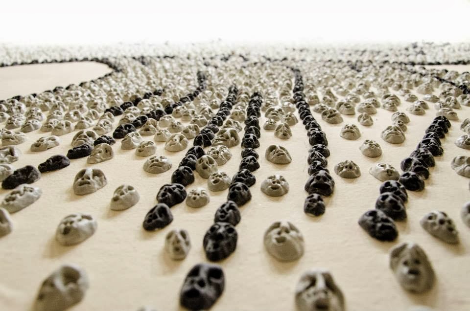 Los rostros son los que se van a yuxtaponer para definir los trazos y las formas de este nuevo Guernika del siglo XXI –sin abandonar nunca su humildad, la misma que demuestra el juego de autorías-, en función de las distancias que aumentan y decrecen progresivamente hasta ofrecer el color neutro a partir del propio tono de las figuras. Éstos establecen una nueva complicidad con la obra de Picasso al limitarse al blanco y al negro, quizás los mismos que en 1936 dieron a conocer al mundo entero lo ocurrido en la localidad vasca a través de los medios de información. Esta manera de tratar el material a modo de fractales nos remite a la técnica y a los principios cromáticos de los neoimpresionistas o impresionistas científicos. En cambio, frente a la homogeneidad de los puntos cromáticos de aquellos divisionistas, Germán Díez ha individualizado formal y cromáticamente a cada una de estas facies como reivindicación de la importancia de cada individuo cuando se trata de masacres, a diferencia del poder deshumanizador de las estadísticas. Si para los neoimpresionistas, -muchos de ellos comprometidos anarquistas- la cantidad ofrecía al final la cualidad, para Germán Díez la cualidad deviene en la matanza la cantidad. Picasso ya redujo el “puntillismo” a la simple decoración en una muestra de escultura policromada, exactamente en su serie de seis vasos de absenta fundidos en bronce en 1914, posiblemente con el fin de ridiculizar a los futuristas, quienes habían basado primeramente su estética en las “compenetraciones congénitas” a partir de la teoría cromática de Chevreul, de Rood y del neoimpresionismo, movimiento al que pertenecieron primeramente muchos de sus representantes, algunos de ellos como Severini asentados en París.