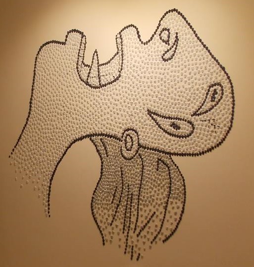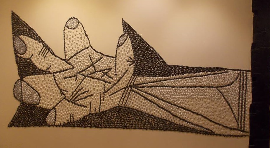Los “fractales” de German Díez son más simples e inocentes. El blanco y el negro, así como la apropiación de un motivo de la Historia del Arte, desmienten cualquier tipo de representación. El tema de su mural estriba precisamente en el material de la obra, en los millones y millones de víctimas de los verdaderos autores de la masacre y que ya el anarquista, exnuclearista y patafísico Enrico Baj, hizo intervenir en 1972 sobre su particular “Guernika-collage” vestidos con los galones fascistas.