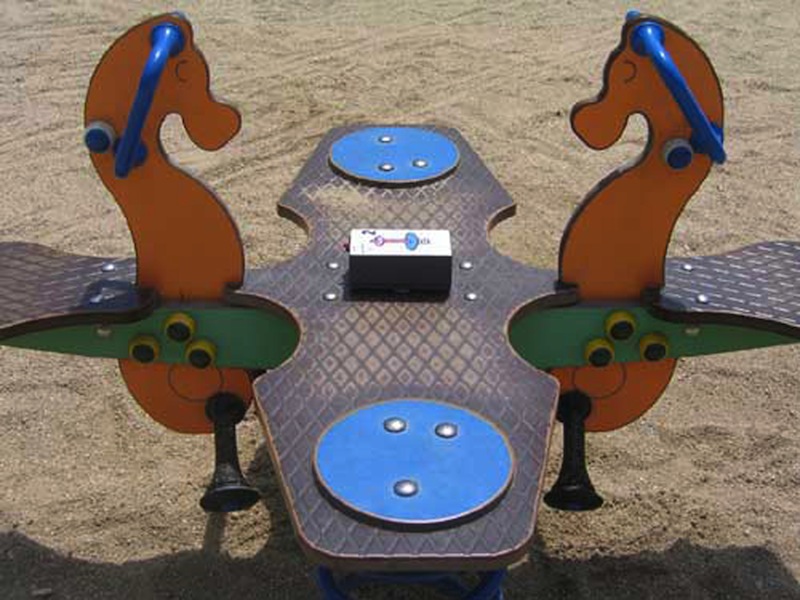 Teniendo en cuenta cómo el ocio de los más pequeños cada vez está más orientado a recursos electrónicos como los videojuegos, los autores proponen la transformación de un parque infantil en un juego interactivo, potenciando, de esta manera, las relaciones de colaboración entre los niños. Para ello colocan un sistema de sensores en las estructuras de juego. Dichos sensores envían señales de movimiento a una PDA en la que transcurre un videojuego y que cada niño lleva a modo de brazalete mientras juega en equipo. Las instrucciones del juego van apareciendo en la PDA a medida que éste avanza y, de este modo, los niños juegan a un videojuego mientras utilizan los elementos del parque (toboganes, columpios, balancines, etc…). Una forma de acabar con la individualidad y el sedentarismo relacionados con los juegos de carácter tecnológico que, además, se vinculan siempre al espacio privado, ofreciendo una alternativa muy lúdica que incide también en valores de tipo pedagógico.