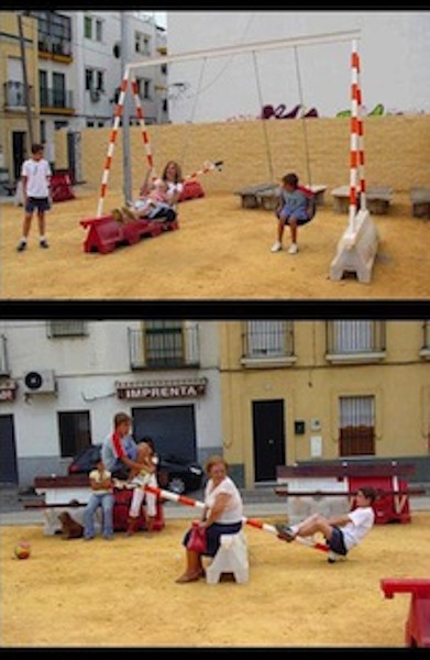 Existen, así mismo, otras opciones pensadas para las personas mayores que intentan mejorar la calidad de vida de las mismas y que desde el punto de vista económico no suponen un gravamen para las arcas municipales. Un ejemplo son unos pequeños pedales incrustados en el suelo en la base de los bancos destinados a que, mientras se relacionan con otras personas, realicen un pequeño ejercicio físico que mejore su movilidad. En esta medida, también puede encontrarse otro tipo de estructuras destinadas a mejorar distintas capacidades motoras y de coordinación. De la misma manera que existen las zonas de juego para niños, esta opción que está empezando a ser implantada en las plazas y parques de algunas ciudades españolas, refleja una necesidad social: cómo el envejecimiento de la población, sobre todo en zonas urbanas, implica una nueva forma de estar en lo público. El objetivo es potenciar un tipo de actividad física que la vida en la ciudad no suele permitir o que, por lo menos, reduce considerablemente.