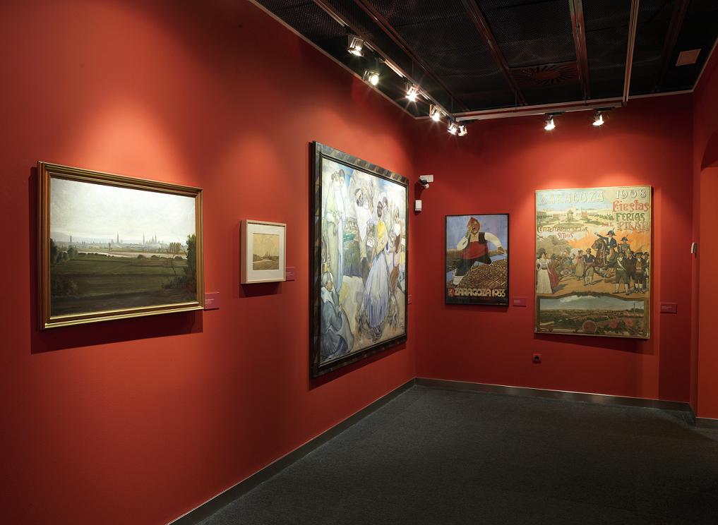 Así, en el primer caso, contamos con sendos ejemplos de óleos costumbristas firmados por Juan José Gárate, con Vista de Zaragoza (1908), y por Marín Bagüés, con La jota (1932) -que ya introduce recursos vanguardistas para expresar dinamismo-, o algunos ejemplos de carteles realizados para las fiestas del Pilar de 1908 y 1933, de Victoriano Balasanz, y Enrique Ortega Frisón respectivamente, en los cuales se incluyen panorámicas de la ciudad siempre como telón de fondo, contraste a menudo de una realidad tecnificada con un protagonismo de motivos emblemáticos.