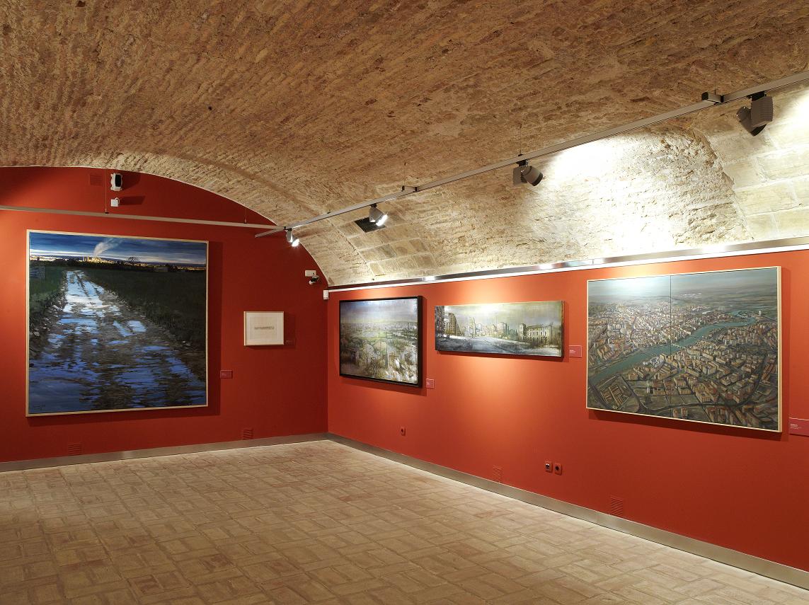 Miguel Ángel Arrudi observa una Zaragoza progresiva, marcada por un fenomenal trafico aéreo, en una extensa panorámica general de su skyline. Otra vista global pero, esta vez, casi un remedo acrílico de la fotografía aérea, es lo que nos ofrece Fernando Bayo en su reciente Zaragoza 2008.