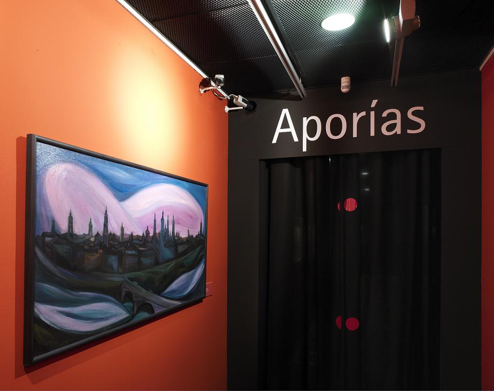 El efecto del montaje de las salas marca una distinción, no sólo pragmática, sino también de concepto. Mientras la sección dedicada a los “Retratos” matiza la usual organización del soporte sobre el muro con un delirante fondo rojo -recuerdo del escudo de la capital-, las “Aporías” se reparten homogéneas en disposición y estructura, pendientes sobre un fondo ondulante de cortina negra, incierta, mate, y cuentan con el anuncio de las autorías y los datos técnicos en sendas placas metálicas de chapa galvanizada antepuestas a cada pieza, y situadas sobre el suelo, forrado en negro, en consonancia con los marcos adaptados que realzan las piezas, que vuelven a homogeneizar -tras la incursión del artista- las obras expuestas. Curioso intermediario éste, entre el público y la obra, que nos recuerda, en algún sentido, a esas planchas metálicas con las que el minimalista Carl André trazaba brillantes recorridos que el observador se resistía a pisar: una nueva conexión entre plástica y construcción, de conceptos, de espacios.