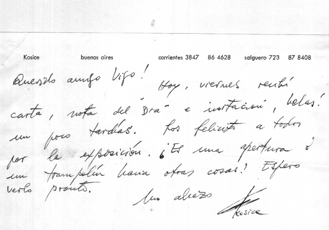 Posteriormente Vigo destacará este aspecto en las apreciaciones de Gyula Kosice cuando, en la sección plástica del diario El día, escribe que se observa en el “escultor” “un no respecto por los materiales nobles heredados”, la ruptura tradicional del marco y la introducción debido a la superficie irregular de la obra-objeto: “Pese a que Madí utilizará para autoclasificarse en sus teorías un léxico que respeta las diferencias entre las palabras pintura – escultura. Sin embargo el resultado es una perfecta simbiosis entre estas dos disciplinas” (1968a).