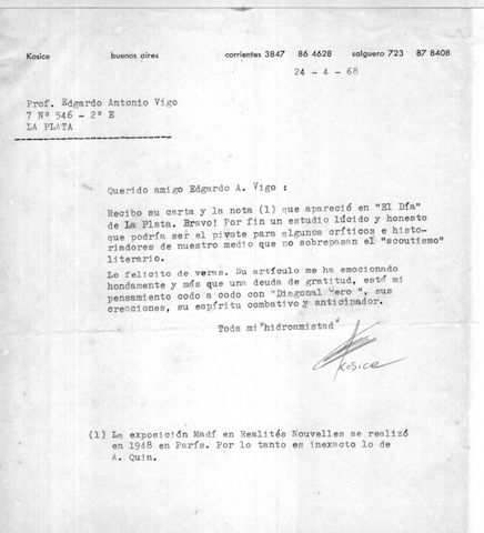 | IMAGEN 3. Envío Kosice a Vigo [“Hoy, viernes recibí carta…”] en Edgardo Vigo, Biopsia 1968. CEAV, La Plata. Inédito. | IMAGEN 4. Envío Kosice a Vigo [“Recibo su carta y la nota…”] en Edgardo Vigo, Biopsia 1968. CEAV, La Plata. Inédito. |