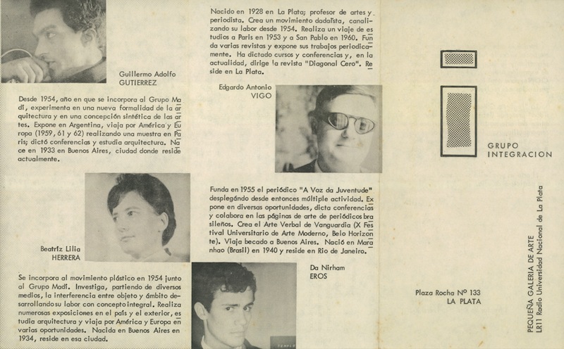 Desde la ciudad de La Plata, a comienzos de los años sesenta, Edgardo Antonio Vigo (La Plata, Argentina 1928-1997) conformó un grupo llamado Integración, que constituye el objeto de estudio en esta oportunidad.* Se pretende con estas líneas contribuir a la recuperación de un hito relevante que ha sido soslayado en los relatos del arte arte argentino porque conecta dos instancias que, no obstante, no han sido objeto de estudio en tesis doctorales relativamente recientes aunque su tema lo amerite; me refiero a El arte abstracto. Intercambios culturales entre Argentina y Brasil, de María Amalia García (2011) y Objetos para transformar el mundo. Trayectorias del arte concreto-invención, Argentina y Chile, 1940-1970, cuyo autor es Alejandro Crispiani (2011).