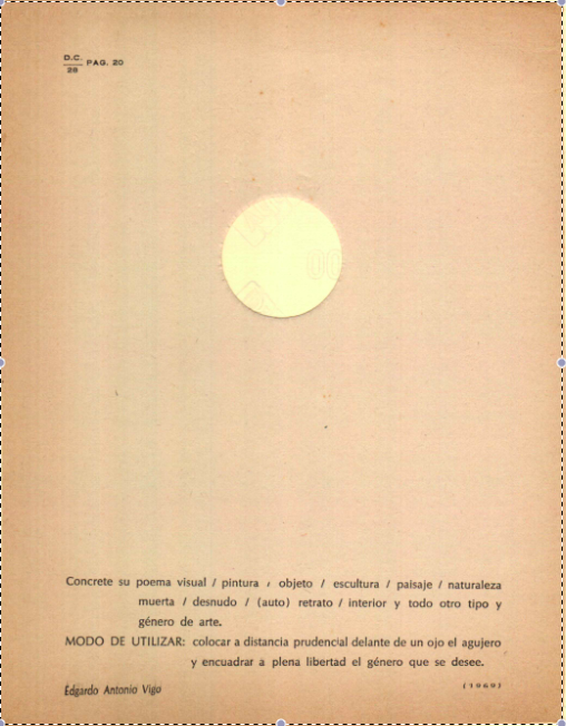 [5]“un arte tocable que se aleja de la posibilidad de abastecer a una ‘elite’ que el artista ha ido formando a su pesar, un arte tocable que pueda ser ubicado encualquier ‘habitat’ y no encerrado en Museos y Galerías. un arte con errores que produzca el alejamiento del exquisito. (…) no más contemplación sino actividad. no más exposición sino presentación. Donde la materia inerte, estable y fija, tome el movimiento y el cambio necesario para que constantemente se modifique la imagen.” (Vigo, 1968-1969)