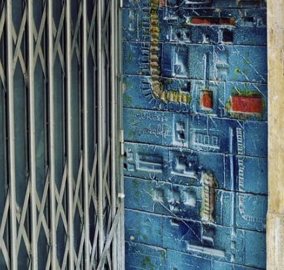 Pero, además de esta singular obra de Las Américas en Barcelona, nos encontramos también otro ejemplo de mural cerámico realizado, en este caso, por Gomballest para la desaparecida empresa leridana Construcciones Griñò en el municipio Les Borges Blanques (Lleida). Este negocio estaba ubicado en la calle Marquès d’Olivart, 10 y para decorar la entrada encargaron un mural cerámico a MURESA (figura 4) que todavía a día de hoy se mantiene en su ubicación original, aunque un poco deslucido por el paso del tiempo y la falta de mantenimiento. Esta obra es muy característica de la producción cerámica que MURESA y, en concreto Grávalos y Gomballest, realizan durante estos años que transcurren del 73 al 75. Se trata de un mural con un rico y brillante cromatismo de tonos azules, sobre los que resaltan amarillos y rojos y que está realizado una gran riqueza de texturas superficiales creadas a partir de impresiones de diferentes objetos siguiendo un ritmo geométrico de carácter abstracto. Esta obra tiene muchos puntos en común con la que encontramos en la Urbanización Amelia de Cuarte de Huerva, también realizada por Gomballest.