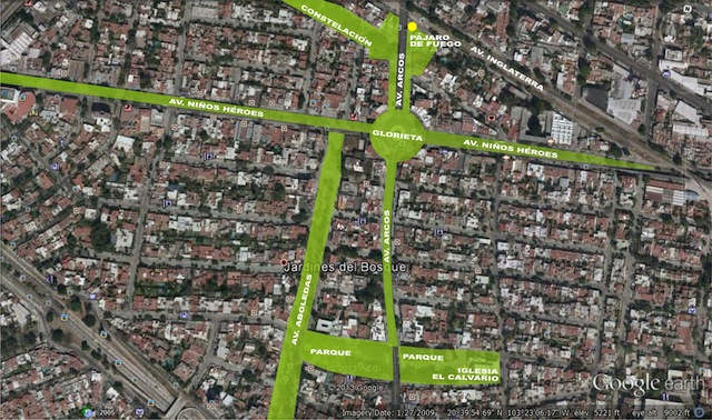 Imagen 12.   Fotografía satelital extraída de Google earth (Imagery date: 1/27/2009), modificada por el autor para mostrar las áreas verdes aledañas a la escultura en el momento de su fundación.