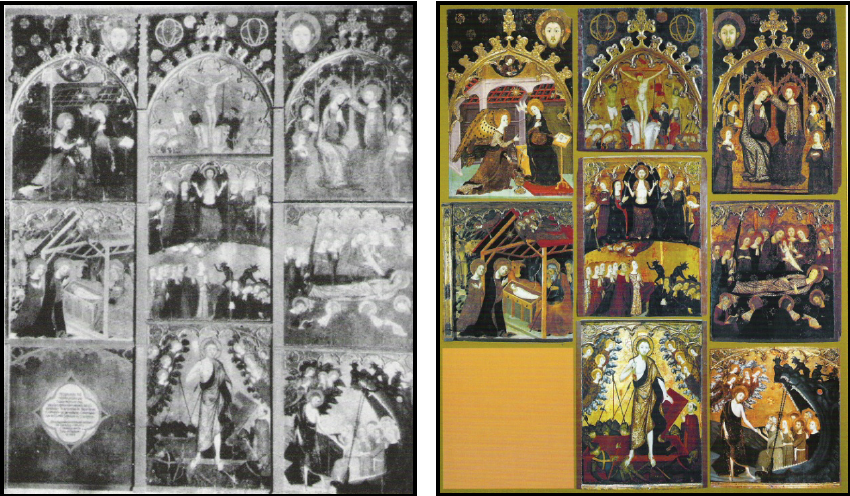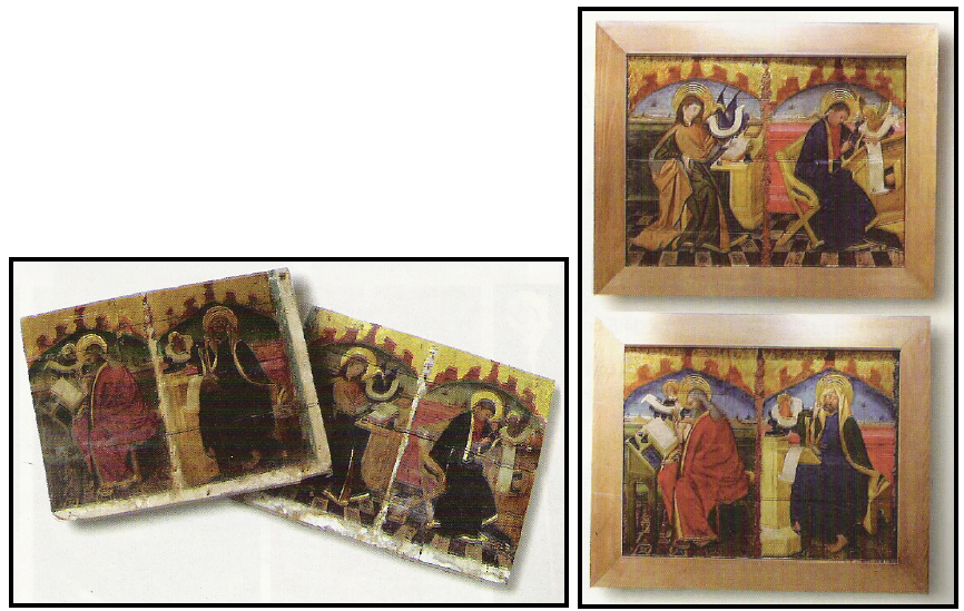 Imágenes 6 y 7 : Tablas de la pedrela de los Evangelistas del Museo Colegial de Daroca antes y después de la restauración, realizada por la escuela taller Damián Forment en el año 2002. Fotografía: Escuela Taller Damián Forment.