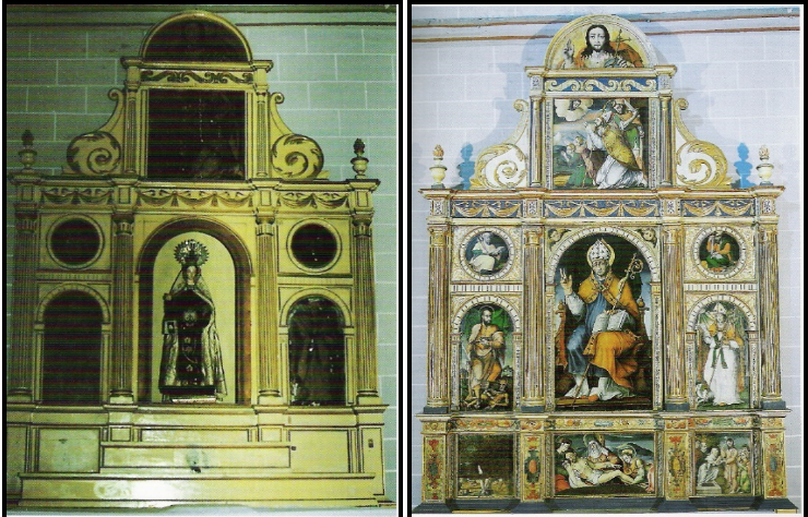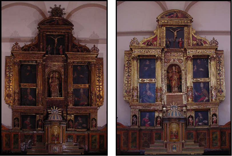 Imágenes 11 y 12: Retablo de San Gil antes y después de la restauración realizada por la empresa Jaime y Cacho finalizada en 2004. Fotografía: Nora Ramos.