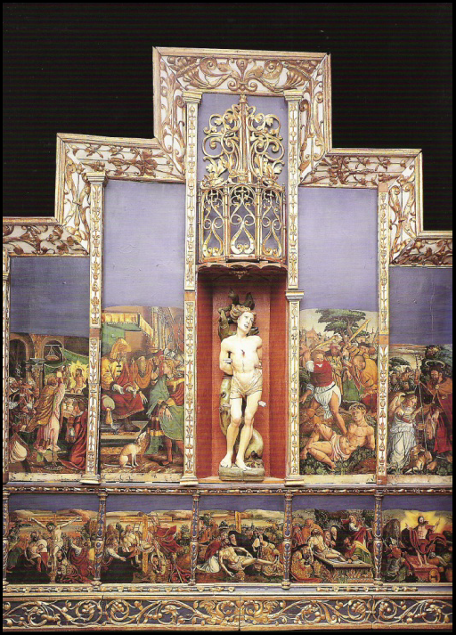 Imagen 10: Retablo de San Sebastián, en la Iglesia Parroquial de Santa Ana, de Mianos (Aragón). En este caso se optó por un método de restitución más clarificador e integrado en el conjunto mediante la tinta neutra. Fotografía: Joyas de un Patrimonio, 2003.