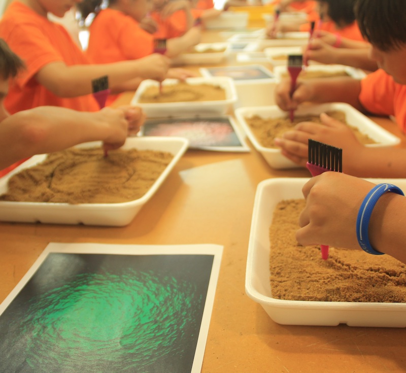 En el taller, a nivel teórico, se plantea la obra de Orús con el poder de transportarnos a diferentes mundos, donde, en la pintura es tan significativo lo que vemos, como lo que no vemos; es decir, el mundo de lo oculto. Para ello cada visitante experimento lo matérico con arena a partir de los trazados de formas geométricas del mundo artístico de Orús como son los círculos o espirales quebradas.