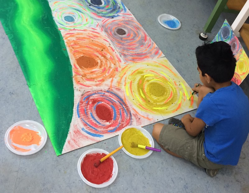 Combinado las dos primeras partes se mezclaron la arena con la pintura fluorescente para elaborar un mural colectivo a partir de cuadrantes que les permitía trabajar en grupos, con masas matéricas de colores que aplicaban al mural.