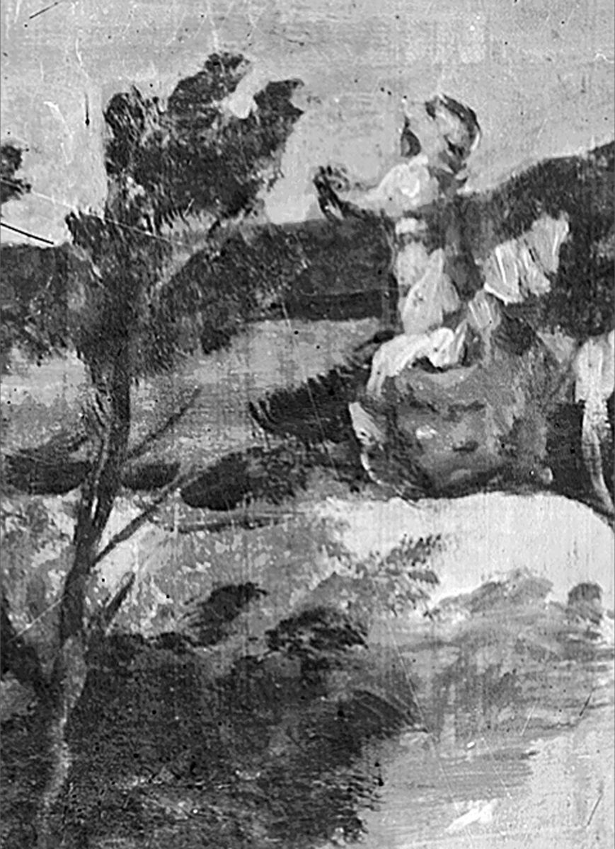 Sobre el realce blanco del lago el artista aplicó igualmente transparencias de extraordinaria frescura a la derecha de las ramas que observamos en la parte inferior del mismo detalle. Estas veladuras albergan únicamente dos valores de intensidad, como todas las fluctuaciones aplicadas por Goya en esta superficie, que fueron totalmente eliminadas en las sucesivas restauraciones que ha sufrido la pintura. También se han perdido los gestos estriados que vemos en las ramas y en los troncos de los árboles. En mi opinión, la naturaleza de estas huellas en la pintura original obedece a la amplia experiencia gráfica obtenida por Goya en sus grabados, que posteriormente repercutirá en sus pinturas. En este óleo, dichos trazos aplicados representan o expresan el movimiento de dichos elementos en el paisaje. Recordemos, a propósito de estas modificaciones, que Nigel Glendinning ya advirtió –en su publicación pionera sobre esta materia– que el restaurador había transformado los degradados más oscuros en el plano del cielo, que vemos tras las figuras en la pintura original, en función de los análisis realizados sobre los positivos de las fotografías de J. Laurent pertenecientes a la colección Witt del Courtauld Institute en Londres. También señaló algunos cambios muy llamativos en la configuración de los árboles situados en el lado izquierdo de la composición, donde Martínez Cubells fusionó dos de dichos árboles en uno solo[1]