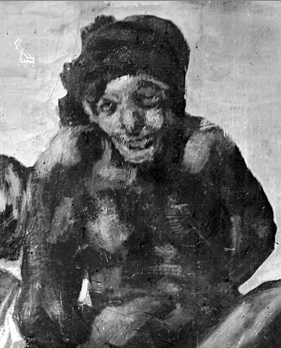 Pero con independencia de los análisis técnicos de esta obra que presentaré en próximas publicaciones, en este trabajo deseo destacar otras variables, realmente significativas, descubiertas en la figura apresada por las Parcas que se encuentra en el centro de la composición, en la medida en que son determinantes para la interpretación de la escena representada por Goya. En los siguientes detalles de esta última figura (fig. 3 y 4) apreciamos algunos cambios en el modelado del pecho y en el hombro del protagonista, ya señalados por Glendinning en las citadas copias analógicas de las fotografías de Laurent (Glendinning, 1975: 475). No obstante, habíamos aceptado que este personaje miraba al frente con sus dos ojos abiertos, en función del actual estado de la obra conservada en el Museo del Prado, tras las transformaciones obradas por su restaurador, quien repintó el ojo izquierdo (derecho según nuestra posición) de esta figura con una mancha negra que simula que el mismo está abierto[2]. La escasa definición de los ojos de este personaje en las reproducciones analógicas de las fotografías de Laurent impidió detectar este cambio sutil, pero importante a la hora de concretar el verdadero estado del protagonista de la escena. Ahora bien, si prestamos atención al detalle aportado sobre esta última fotografía veremos sin dificultades que el ojo izquierdo de su rostro está, por el contrario, completamente cerrado, pero también especialmente hinchado. Además, Goya ha aplicado una sombra negra muy contrastada que enmarca perfectamente su cuenca orbital. De ello se infiere, en mi opinión, que este ojo revela un claro hematoma, tal y como sucede en el rostro humano cuando es golpeado con violencia, de ahí que permanezca cerrado. Por otra parte, se aprecian igualmente diversas magulladuras en otros lugares de su cara, como por ejemplo en la boca. Todo ello pone de relieve que este personaje ha sido castigado con una considerable paliza. Este último aspecto resulta fundamental para comprender el alcance de la escena representada en Átropos o Las Parcas, dado que pone de relieve a mi juicio las brutales represalias y torturas sufridas por los liberales con la llegada del segundo periodo absolutista de Fernando VII en 1823, tal y como veremos en el apartado destinado a su interpretación.