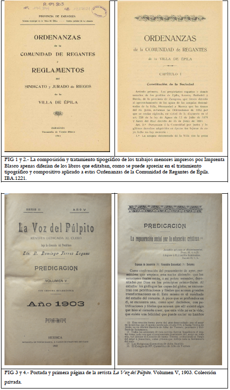 El primer ejemplo (figuras 1 y 2) corresponde a las Ordenanzas de la Comunidad de Regantes de Épila, el segundo ejemplo (figuras 3 y 4) se trata de la revista religiosa La Voz del Púlpito. La composición que se aplica a los diferentes elementos es la que se venía realizando en los libros y que continuaba la tradición tipográfica que apenas había evolucionado desde siglos atrás. Los elementos se distribuyen en la página mediante una composición de eje central. El encabezamiento de los capítulos se adorna mediante una orla tipográfica y un juego tipográfico para el titular.