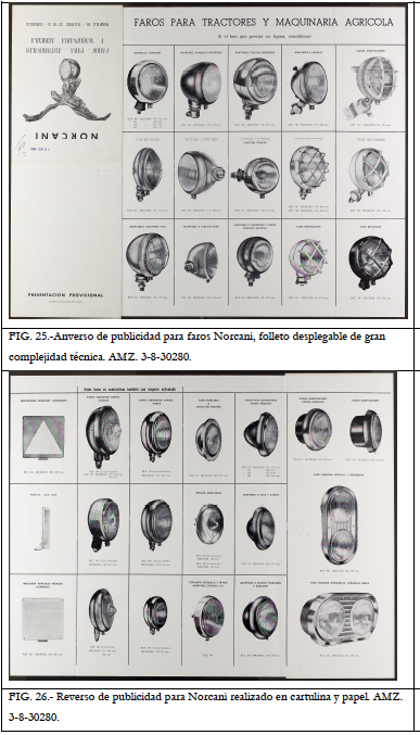 Otros trabajos publicitarios son muy complejos, como el que se muestra en las figuras 25 y 26, realizado para la marca Norcani en 1969, es un catálogo de faros para tractores en formato de folleto desplegable. Está impreso en offset por las dos caras, la dificultad radica en que las divisiones que realiza el plegado en el papel deben coincidir en la cara anterior y posterior. La complejidad que supuso la realización de este trabajo se refleja en las notas personales escritas en las notas del impresor.