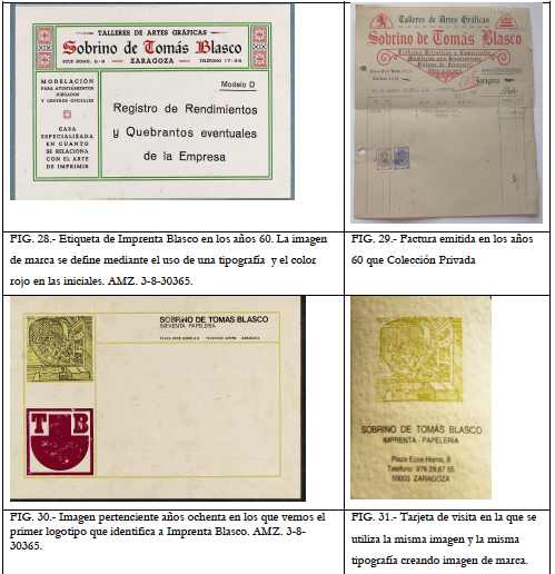 El diseño de identidad corporativa estaba entonces todavía en mantillas: conceptos como el respeto por las imágenes, tipografías y colores que forman una marca fueron aplicándose poco a poco en los documentos de la época con mayor o menor acierto. Buena prueba es la propia imagen de marca de Imprenta Blasco, a través de la cual podemos observar como esta cuestión comenzaba a ser tenida en cuenta, aunque nunca llegó a desarrollarse de manera completa. En las imágenes inferiores vemos portadas de libros de cuentas correspondientes a las décadas de los cuarenta, sesenta y ochenta en los que las tipografías e imágenes que acompañan y representan a la marca van variando. En ejemplos de los años sesenta (figuras 28 y 29) vemos como la imagen de marca se representa mediante la tipografía Gótico Cervantes del catálogo de Richard Gans y que se repite en diferentes documentos. A pesar de que su aplicación en cuanto a pesos, tamaños y colores no fuese rigurosa, podría considerarse una imagen de marca primitiva. En la década de los ochenta (figuras 30 y 31) perteneciente a la década de los ochenta, vemos el primer logotipo que identifica a la empresa que está formado por las iniciales colocadas sobre una semicircunferencia y enmarcado en un cuadrado. El logotipo va acompañado de un grabado que representa un taller impresor antiguo. La tarjeta de visita de la imprenta utiliza este mismo grabado y la misma tipografía de palo seco.