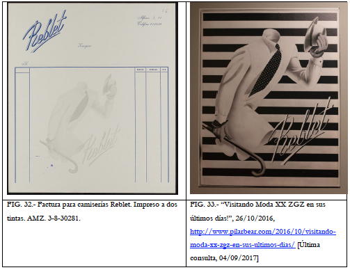 Algunas marcas como Tuga recurrían a la labor de un dibujante para ilustrar su marca, otros prescindían del dibujo, como el logotipo de Laboratorios Quimicamp, y realizan su logotipo exclusivamente mediante elementos tipográficos. La imagen de marca de camisería Reblet (figura 33) utiliza como imagen principal un dibujo realista de gran calidad inspirado en las imágenes de cartelería cinematográfica tradicional. El nombre de la marca utiliza una tipografía caligrafiada. Desconocemos el autor de la ilustración, sin embargo podemos adivinar su gran calidad y profesionalidad. La factura impresa reúne los elementos principales de la marca y los reproduce de manera sencilla y elegante.