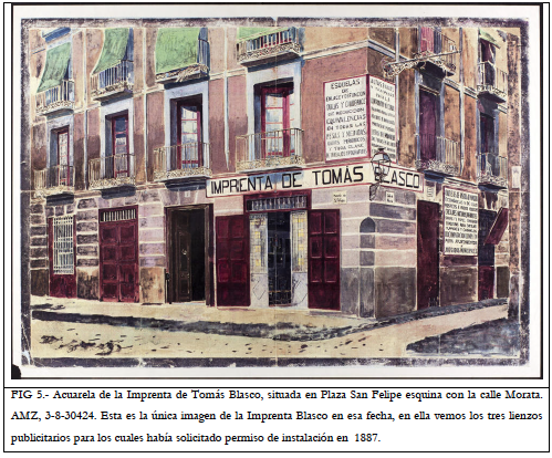 En su etapa inicial, hacia 1887, Tomás Blasco solicita permiso para colocar tres lienzos en la calle Violín, en los que publicite su actividad.Esta licencia, AMZ (1887), Fomento, Caja 1554, Exp. 1178,le es concedida. La información que tenemos sobre aquello que se anunciaba en los letreros la podemos consultar gracias a una acuarela (Figura 5) en la que se representa la fachada de la imprenta, donde podemos leer: