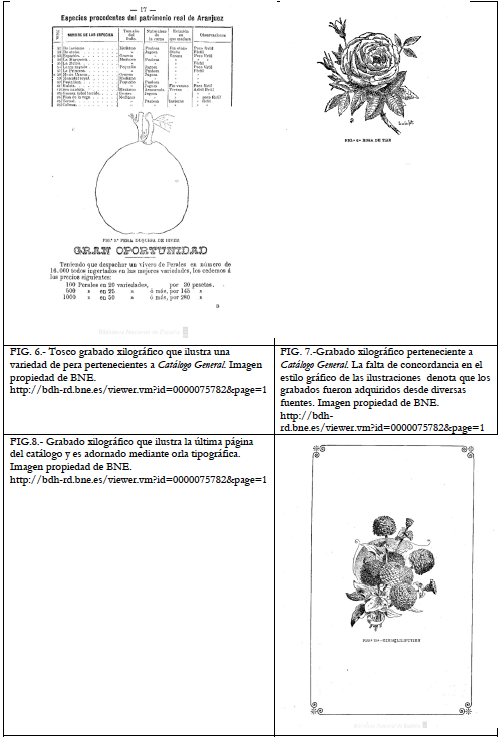 Asimismo observamos como las páginas interiores son ilustradas mediante dibujos de muchas variedades que se mencionan en el catálogo. Las impresiones son grabados y algunos de ellas aparecen firmadas por sus autores. Posiblemente perteneciesen a algún repertorio de imágenes y fueran adquiridos de manera temporal. Algunos de los grabados son bastantes sencillos e incluso toscos (como el que vemos en la figura 6), otros como el que hace de colofón del libro (figura 8), tienen gran cantidad de detalles. Los grabados que ilustran el catálogo no guardan concordancia de estilo entre ellos ya que posiblemente fuesen los únicos disponibles para ilustrar las diferentes variedades vegetales.