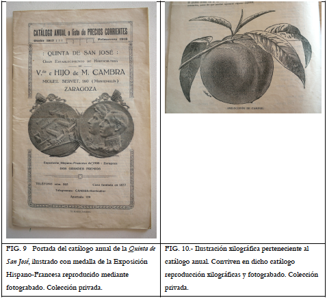En Zaragoza, la Exposición Universal también supuso un cierto empuje en la fotografía y las artes gráficas. Las imprentas y talleres fotográficos conscientes del escaparate comercial que suponía el evento se esmeraron en la producción gráfica realizando alardes técnicos en sus impresos. La exposición también supuso la consolidación del gusto modernista, si bien su implementación en los materiales gráficos quedó limitada a aspectos más superficiales como el uso de algunas tipografías o de adornos dibujados de manera puntual como indica Amparo Martínez Herranz (1991). Imprenta Blasco también vio incrementado su volumen de trabajo con motivo de la exposición. Podemos ver en la documentación como fueron impresos los libros contables utilizados por las posadas para inscribir a sus clientes en los establecimientos. Posiblemente las imprentas de la ciudad se vieran desbordadas de trabajo, ya que estos trabajos para estos clientes se hicieron de manera puntual coincidiendo con dicho acontecimiento. Algunos de sus clientes habituales incrementaron la producción de material gráfico con motivo de la exposición, tal es el caso del horticultor Mariano Cambra. Este industrial, como veíamos anteriormente, tenía la costumbre de utilizar gran cantidad de imágenes ilustrando sus catálogos y listas de precios. Su establecimiento fue premiado en la Exposición Hispano-Francesa, hecho que aprovechó para ilustrar la portada del catálogo con la imagen de la medalla realizada por la casa Abduiza de Bilbao (García Guatas, 2013) en la que se reproducen los retratos de los monarcas Alfonso XIII y María Victoria de Battenberg. En el reverso de dicha medalla aparece una vista aérea de los edificios que componían el recinto de la exposición. La fotografía de la medalla es reproducida en el impreso mediante fotograbado (figura 9) siendo esta una de las primeras veces que Imprenta Blasco utiliza esta nueva técnica. La exhibición de este tipo de premios era un recurso publicitario muy habitual entonces, llegando en ocasiones a ser premios ficticios.