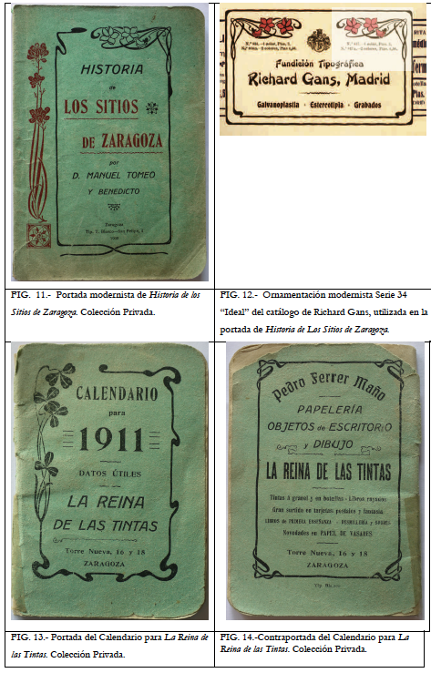 Con motivo de la Conmemoración de los Sitios de Zaragoza en 1908 y continuando esa incipiente moda modernista, es impresa Historia de los Sitios de Zaragoza, un pequeño libro de 10 x 15cm (figuras 11). La portada está decorada con una orla curvilínea y elementos florales e impresa a dos tintas, la introducción del color es otra técnica recurrente en la nueva moda. Encontramos el adorno floral en el catálogo de Richard Gans de 1923 (figura 12). Tres años más tarde, en 1911 este mismo formato y materiales son utilizados para la realización de un calendario para La Reina de las Tintas (figuras 13 y 14), comercio dedicado a la fabricación y comercialización de tintas, proveedor de todas las imprentas zaragozanas. La orla curvilínea y los motivos florales que adornan la portada y contraportada remiten también a un carácter modernista.