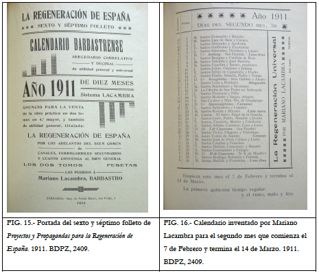 El segundo folleto versa sobre los canales de riego de Barbastro y Sobrarbe. El cuarto y el quinto folleto son coplas y jotas de tema aragonés. El tomo seis y siete es un calendario barbastrense, con un sistema propio ideado por el autor y denominado “sistema Lacambra” y para el que el autor solicitó la propiedad intelectual y se encontraba a la espera de ser concedida, espera que se demoraría en el tiempo como así refleja en sus escritos. El innovador calendario introduce el sistema decimal, de manera que son diez los meses del año.