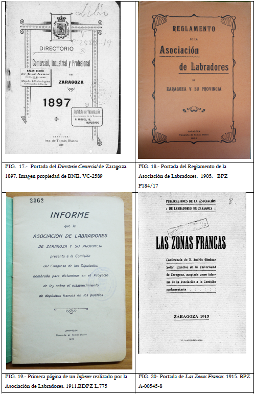 Otra de las tipologías de documentos que Imprenta Blasco realizó profusamente fueron las publicaciones profesionales, realizadas en su mayoría durante la última década del s. XIX y primera del s. XX. Años estos que sociológicamente coinciden en Zaragoza con el nacimiento de lo que posteriormente se denominarán clases medias y que se trata de un grupo socioeconómico muy heterogéneo que comienza a unirse para defender sus intereses. Esta situación se enmarca dentro de un contexto en el que la situación política era muy inestable y los movimientos obreros comenzaban a ser muy activos y conflictivos hacia los poderes públicos y la sociedad en general en defensa de sus intereses. Este fenómeno es común a toda Europa y recibió el nombre de “corporativismo”, es definido como la pertenencia al grupo profesional para perseguir la defensa de sus especificidades e intereses. A este respecto se elaboraran estatutos, reglamentos, documentos que difundían sus intereses particulares, u otros como carnets de afiliación, boletines de inscripción, etc.