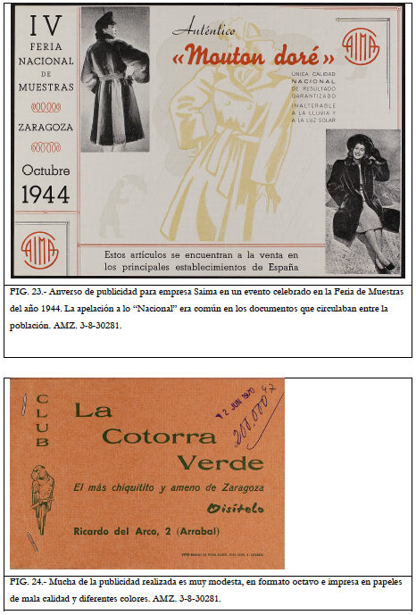 En la documentación consultada en AMZ, este tipo de trabajos comienza a ser archivado y guardado de manera sistemática. Se conserva una muestra del trabajo realizado junto con apuntes sobre las características técnicas de la impresión, número de ejemplares, presupuesto y, en algunas ocasiones, apuntes personales que arrojan opiniones espontáneas de los trabajadores. La publicidad es entonces un vehículo fundamental para generar actividad económica y los productos publicitarios se adaptan a todo tipo de negocios, desde los más especializados (figura 23) a aquellos más humildes (figura 24).