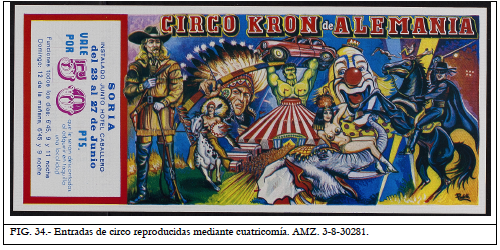 El sector del ocio y los espectáculos ha sido un gran demandante de productos gráficos desde mediados del s. XIX de manera que su estudio nos proporciona una trayectoria acertada sobre la evolución de las técnicas de reproducción. Ejemplo de ello son los carteles de festejos taurinos, los carteles, programas y anuncios de teatro, invitaciones a exposiciones, el cartel de cine, los festejos de ferias populares, los menús y cartas de restaurantes, etc. Imprenta Blasco realizó gran cantidad de estos impresos, como muestra podemos ver la entrada para circo reproducida mediante cuatricomía (figura 34).