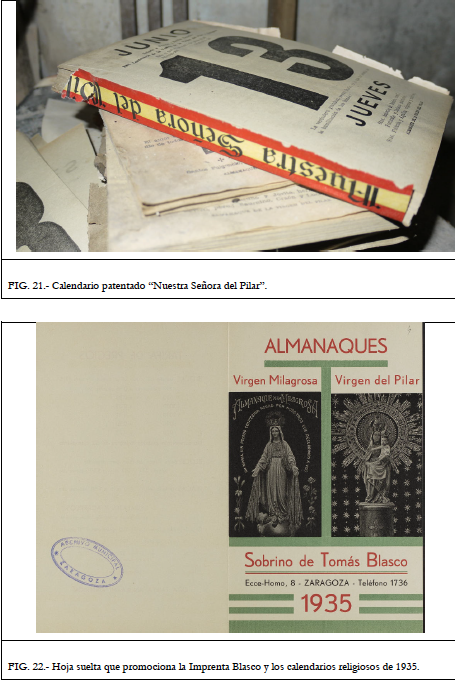 La producción realizada por Imprenta Blasco en esta época es en muchas ocasiones de tipo religioso queparece ser la oportunidad de negocio viable que nuestra imprenta eligió para seguir manteniendo el volumen de trabajo. Imprenta Blasco había adquirido en 1928 la patente para la realización de unos calendarios de la Virgen Milagrosa. La marca fue registrada como “Virgen del Pilar” y consistía “en la cubierta de un taco para almanaque de pared cuyo frente ostenta la imagen de la Virgen del Pilar y los lados contienen las inscripciones “Almanaque de la Virgen del Pilar” y en la parte superior la cifra “1928”. Estos calendarios serían comercializados con diferentes formatos y en cantidades variables. Así mismo se realizaba una intensa campaña publicitaria de los almanaques religiosos publicando anuncios en prensa y editando hojas sueltas que difundían los formatos de venta y las tarifas (figura 22).