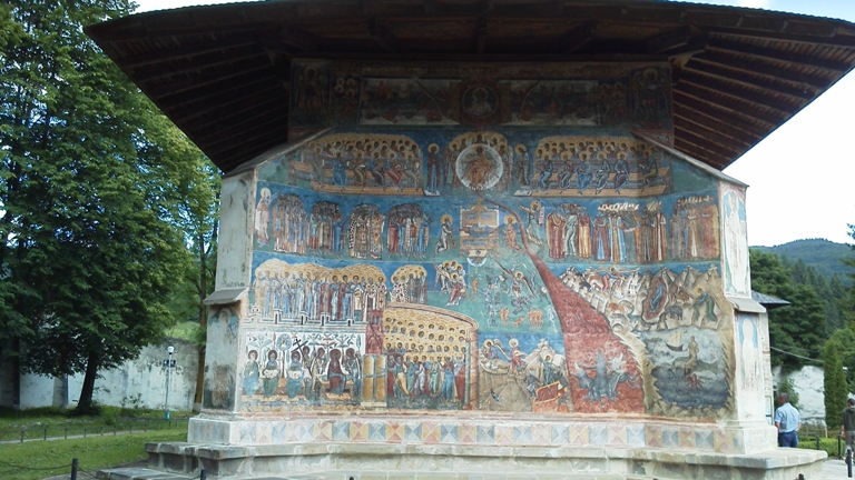 La iglesia ortodoxa se caracteriza por la profusión de pintura mural para mostrar y educar a los fieles durante los días de festividades religiosas, pero aquí, en esta zona de Rumania hablamos de monasterios pintados por estar recubiertos tanto en su interior como en el exterior, auténticas biblias ilustradas y crónica de la lucha contra los turcos, pintadas minuciosamente con colores que aún se mantienen vivos y fuertes.
