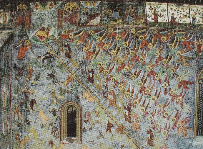 Las pinturas exteriores mejor conservadas en su conjunto se encuentran en el monasterio de Sucevita. En la fachada norte se representa la Escalera de las virtudes, composición de considerable tamaño, dividida en diagonal por una gran escala por donde asciende los justos que siguen el camino de la perfección, y que son animados y confortados en su ascensión por ángeles perfectamente ordenados en filas. De esta escalera caen los pecadores que intentan no ser arrastrados al caos por demonios que tiran de ellos.