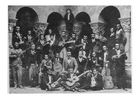 La “Rondalla Oscense”, posando en el claustro de la Iglesia de San Pedro el Viejo de Huesca. En el centro su director, José Bitrián. 1902.