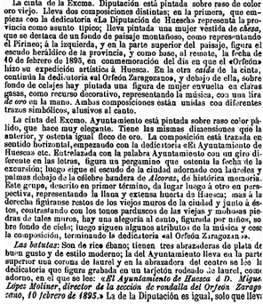 A pesar del sonado éxito, la sociedad del Orfeón tuvo un “quebranto” de 265 pesetas en su estancia en Huesca, pues fueron mayores los gastos que la recaudación obtenida. No obstante, donaron 150 pesetas a la Beneficencia Provincial, y 50 pesetas a la “Olla de los pobres”, en un “hermoso, hidalgo remate de su jornada artística”, tal y como recogía El Diario de Huesca. Además, la actuación del grupo zaragozano fue tan del agrado del público oscense que las principales instituciones locales, la Diputación Provincial y el consistorio, decidieron realizar unos regalos a la agrupación. Por una parte, les fueron entregadas dos batutas de ébano con abrazaderas de plata labrada. También se les hizo entrega de dos cintas destinadas a pender de su estandarte. Ambas cintas estaban pintadas a mano por el artista oscense Félix Lafuente Tobeñas y estuvieron costeadas por las citadas administraciones. Lafuente era en aquel momento profesor interino de dibujo en el Instituto Provincial de Segunda Enseñanza, siendo junto al también pintor Ramiro Ros Ráfales, el tallista Francisco Arnal y el escultor Mariano García, uno de los principales artistas plásticos de la ciudad (Ramón Salinas, 2014). La riqueza de su descripción merece ser reproducida aquí: