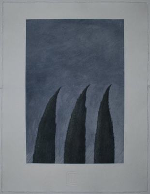 No contento con todo esto todavía Castillo ha decidido enseñarnos otra de sus colecciones, la dedicada a los Cuatro Elementos, en la que imperan la sencillez para el mensaje y la liberalización del trazo hasta su total desaparición. Cuatro estampas en las que tierra, aire, fuego y agua se representan de forma individualizada pero con una relación esencial entre sí, como parte de un todo, un todo que es el mundo entendido por el artista en el que la tierra la encarnan inmensos campos arados que reflejan el paisaje del valle zaragozano, el viento acaricia la copa de erguidos cipreses que se resisten a su envite, lucha que tantas veces pudiera contemplar el autor paseando por las calles alrededor de su taller, el fuego es una gran mancha roja, viva e incandescente, y el agua una relajante masa de azul ondulada y fresca. La sencillez como estilo de vida, la calma como filosofía, la música y la literatura como complementos del alma.