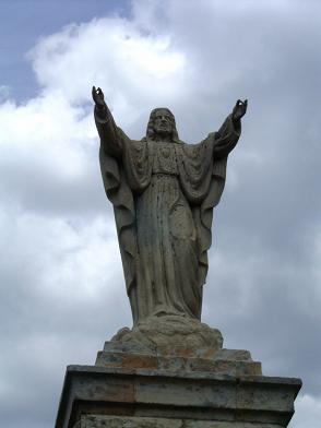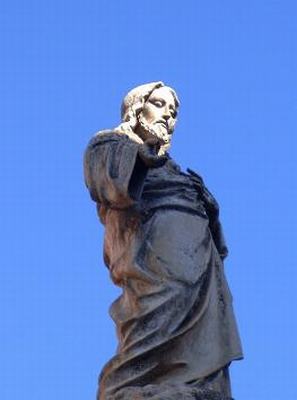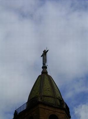 La iconografía de la imagen ideada por Higinio Bastear es considerablemente distinta al del resto de las imágenes. La figura de Jesucristo se alza sobre una bola del mundo en una posición algo inestable por la redondez de esta suerte de pedestal. Esta posición le sirve al autor para marcar un movimiento que hasta el momento sólo se conseguía con la caída en cascada de los paños, que en ondas se disponen hacia lo largo del cuerpo de la escultura. La cabeza, de pequeñas proporciones, pasa a un segundo plano y se ladea hacia delante. Sus gestuales brazos se hallan en relación con las posturas manieristas de Miguel Ángel. La extremidad superior izquierda señala el corazón y, la derecha, el cielo en clara alusión a la santidad del personaje. El mal estado de conservación en el que se halla (pátina de óxido sobre la superficie de la piedra) impide interpretar el rostro de la figura.