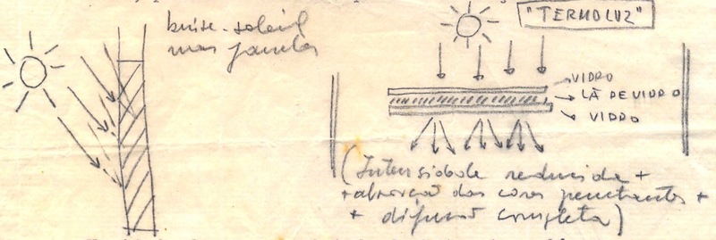 Desenho de Sérvulo Esmeraldo para o Relatório, enviado de Paris, na data de 8 de setembro de 1961. “TERMOLUZ” Vidro, lã de vidro, vidro; intensidade reduzida + absorção das cores penetrantes + difução completa