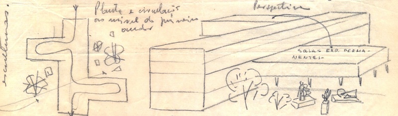 Desenho de Sérvulo Esmeraldo para o Relatório, enviado de Paris, na data de 8 de setembro de 1961. Exp.: […] livre e esculturas; Planta e circulação, no visual do primeiro andar; Perspectiva; salas exposições permanentes