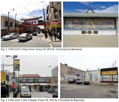 ¿Qué nos muestran estos barrios? En primer lugar, un trazado de las vías que corresponde al trazado del distrito de la ciudad en que se hayan ubicadas y no al trazado de calles estrechas y abigarradas que se corresponderían con la imagen que tenemos de una ciudad china o vietnamita. En segundo lugar, la aparición de unas construcciones que dominan el plano del aire y que deberíamos identificar con las tópicas construcciones en el estilo vernacular correspondiente. En tercer lugar, y entiendo que sería el aspecto más relevante, la ocupación del plano vertical con carteles y enseñas publicitarias que tienen un estilo radicalmente distinto de otras en la ciudad: desde la grafía hasta los colores, que la experiencia nos dice responde a determinados criterios de corte popular. Alguno de estos elementos avanza en el plano del aire. Finalmente, La ocupación del plano vertical con algún tipo de mural que reproduce la idea de la integración de los emigrados en la sociedad EE.UU. al mismo tiempo que señala las diferencias. En definitiva, la vía y la edificación, sigue los parámetros habituales para el resto de la ciudad, lo identitario (Valera, 2010) que podemos tomar como indicio de la popular queda restringido al plano dele espacio público con mayor capacidad adaptativa a situaciones concretas: el plano vertical.