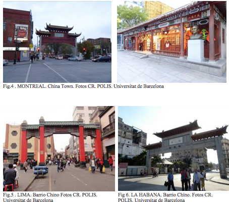 En Lima, el barrio chino está marcado, como en las otras ciudades por un arco de entrada aal estilo que podemos identificar como chino. En el interior del barrio, volvemos a encontrar lo que comentábamos de Chicago: trazado y edificación en consonancia con el desarrollo urbano de la ciudad. Ocupación del plano vertical con elementos de grafía y color diferenciados. En el caso de La Habana, el arco da entrada a una zona completamente idéntica al resto de la ciudad, sin indicaciones acerca de la diferenciación territorial.