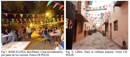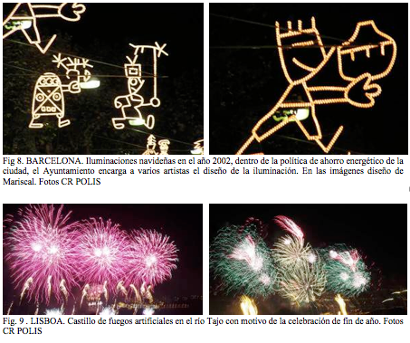 La celebración popular de la fiesta en la calle supone, casi imperiosamente, de algún tratamiento de iluminación y, especialmente, de un fin de fiesta basado en los fuegos artificiales. Cuando la fiesta sobrepasa el ámbito de la calle o del barrio, la celebración es apropiada por la administración local que tiene la obligación de organizar eventos y festejos para “todos”. En base a las actividades populares, la administración local instalada en el orden lejano, con el argumento de hacer llegar la fiesta a todos y también, con argumentos fundamentados en temas de seguridad en el espacio público, organiza la fiesta para todos. En esta fiesta, la ocupación del plano del aire es fundamental. Es obvio que estas celebraciones no dejan de ser populares, en el sentido en que gran parte de la población de una ciudad puede sentirse identificada con ellas, pero pierden el carácter de agencia de las celebraciones populares, para convertirse en un espectáculo que, poco a poco, se incorpora al conjunto de espectáculos que definen y dan carácter a una ciudad turística. En palabras de Muñoz, aquello que acontece en el espacio público se “urbanaliza” ((Muñoz, 2008).
